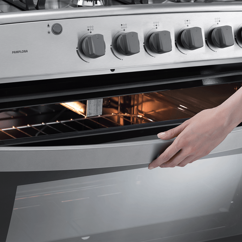 Gracias a su encendido electrónico por pulsante, pondrás en marcha la cocina a gas 6 quemadores y su horno en instantes. Este último posee luz, grill a gas, doble vidrio templado para vigilar tu preparación y una plancha asadora, dándole total versatilidad.