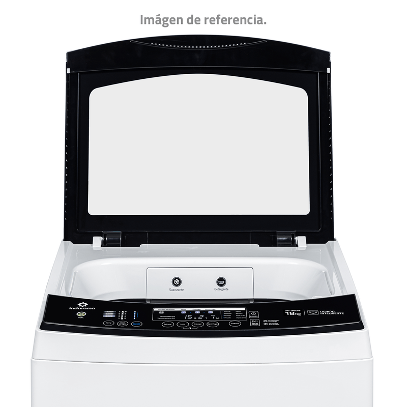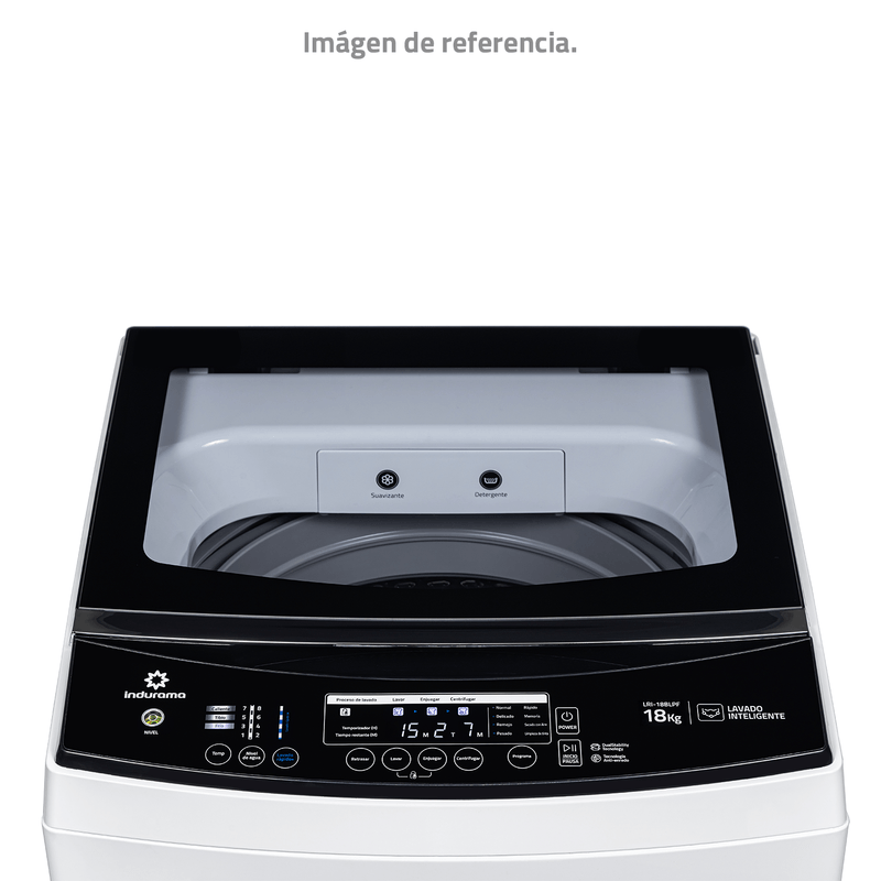 Lavadora Indurama 18 kg con Tecnología Anti‑Enredo, DualStability y Función Air Dry. Motor potente de 600W y ahorro inteligente Fuzzy para un lavado eficiente y sin complicaciones.