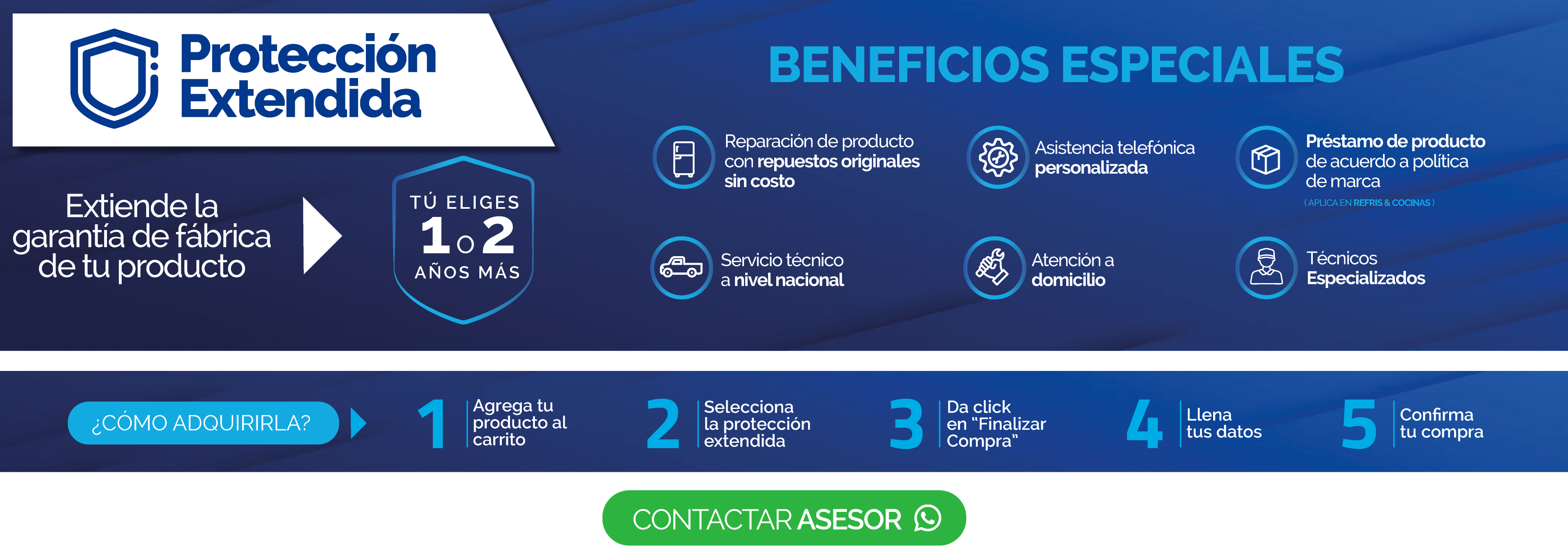 Esta protección es intransferible y aplica únicamente para el artículo registrado en el certificado de Protección Extendida e incluye repuestos originales de fábrica y mano de obra de nuestros técnicos calificados y certificados, dentro del país de compra de la protección.