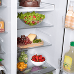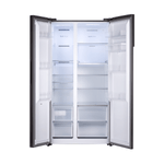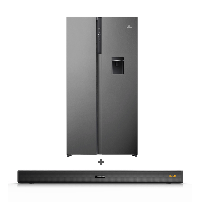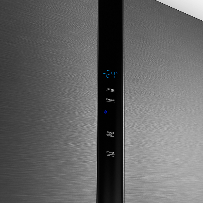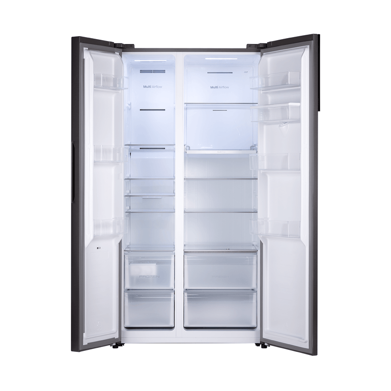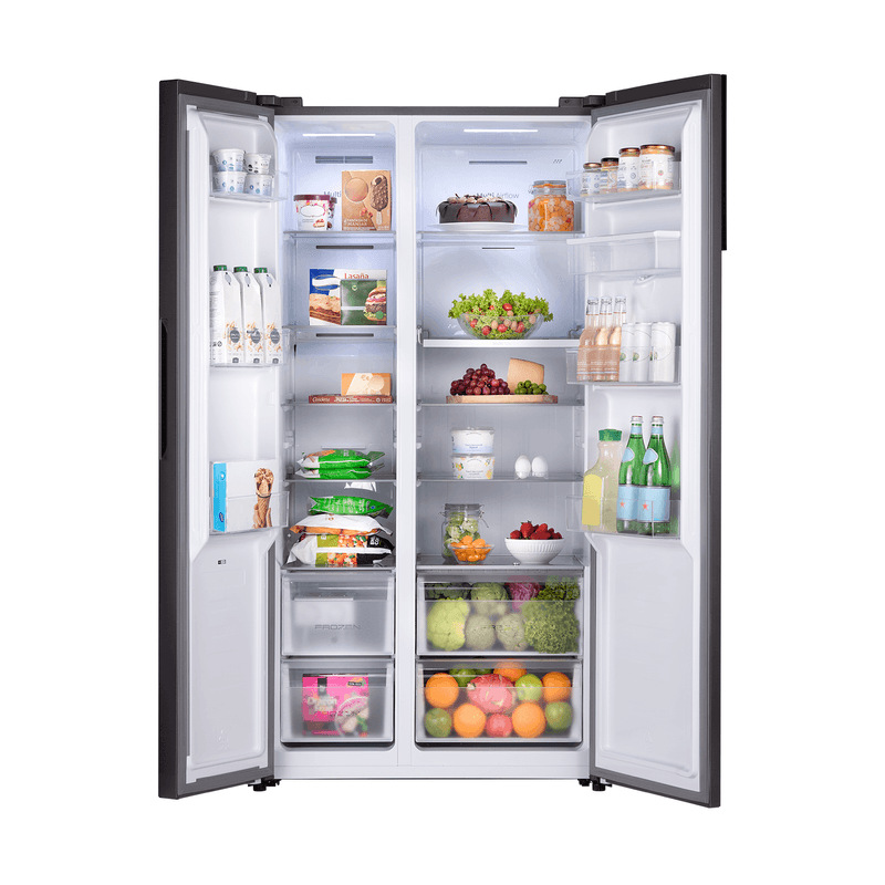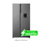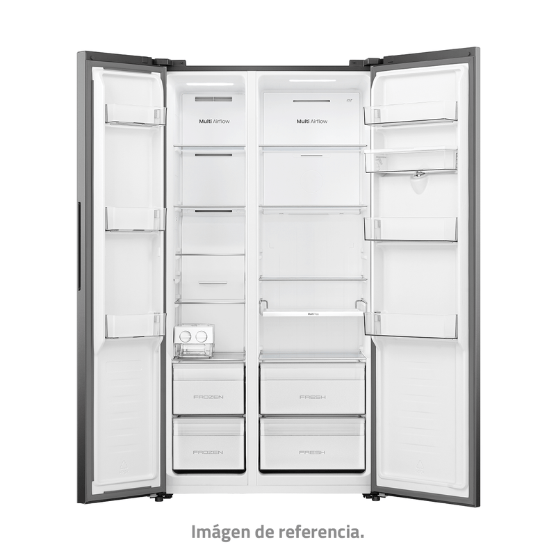 Refrigeradora Side by Side de 568 L con compresor Inverter, AI FreshSense y Multi Airflow para una temperatura estable y frescura prolongada. Diseño PureFlat Door en acabado Croma, Total No Frost, control digital, dispensador de agua y eficiencia energética A.